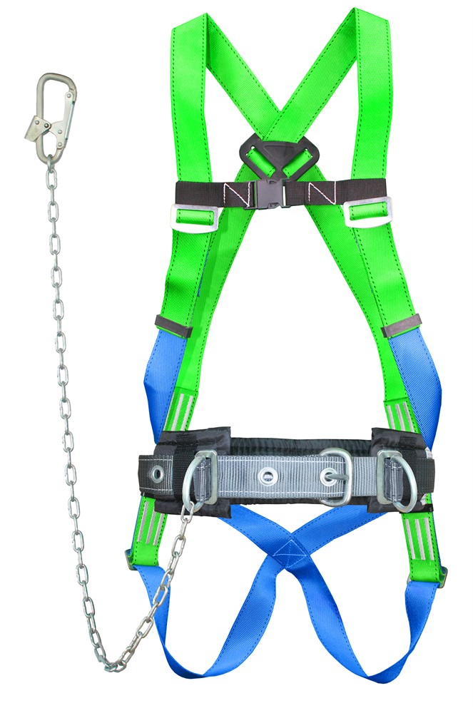 Пояс состоит из ремня с пряжкой, кушака, наплечных и набедренных лямок, двух D-колец на поясе и одного на спине (для страховки или спасательных работ и экстренной эвакуации) и стропа - металлическая цепь с монтажным карабином. Пояс упакован в водонепроницаемый пакет и содержит паспорт и инструкцию по применению.