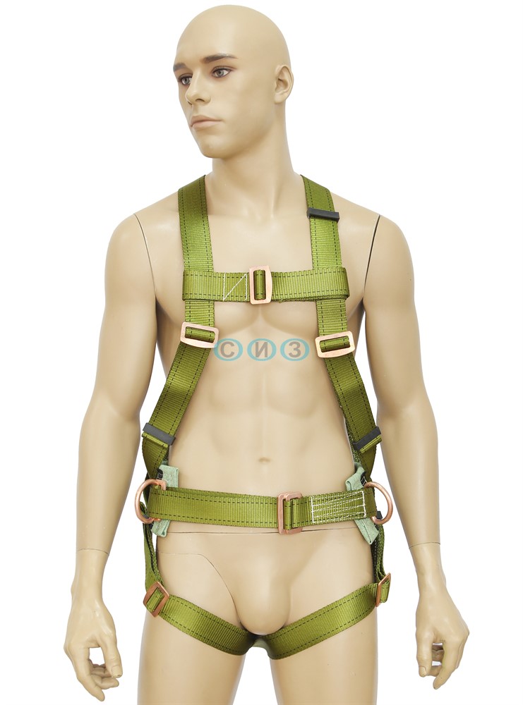 Состоит из наплечных и набедренных лямок, ремня с пряжкой, кушака, двух D-колец для удержания и позиционирования, заднего D-кольца (элемента крепления) на спине и переднего элемента крепления (двух петель) для спасательных работ, экстренной эвакуации, страховки поднятия и опускания из замкнутых пространств. Все стальные детали имеют гальванопокрытие "меднение". Лента антистатичная. Кушак из брезента. Привязь упакована в водонепроницаемый пакет и содержит паспорт и инструкцию по применению.