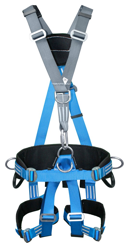 Страховочная привязь парашютного типа с наплечными и набедренными лямками которые регулируется самофиксирующимися пряжками, двумя элементами крепления стропа для страховки(на груди и спине) и тремя - для удержания и позиционирования(на поясе).