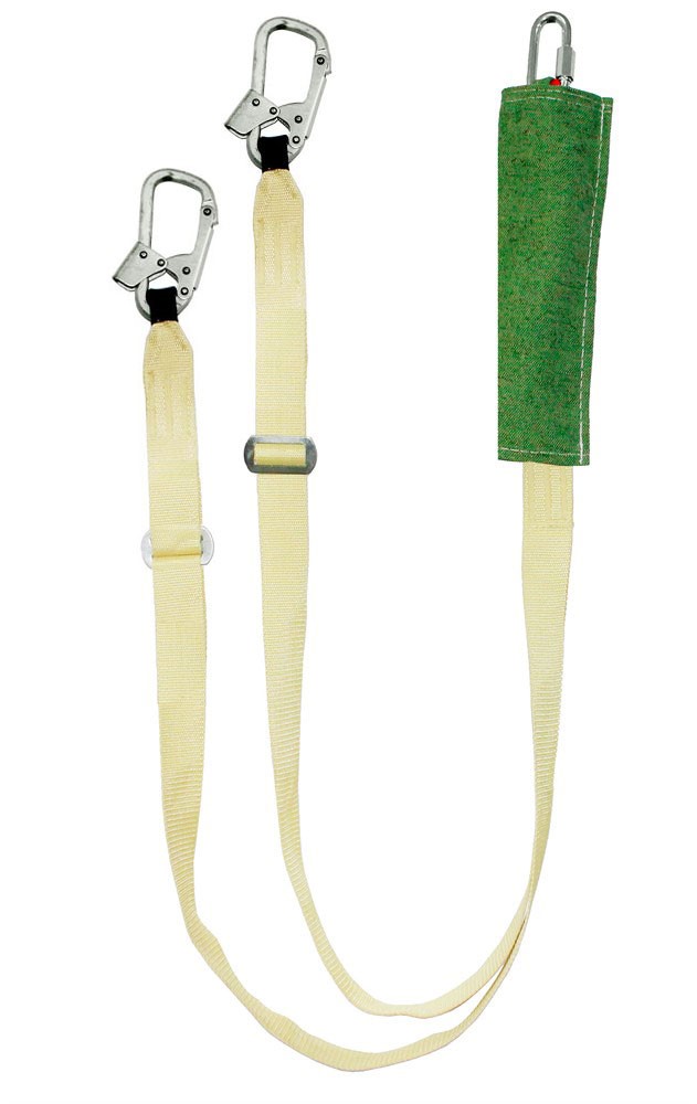 Строп аАдрегог+Кс - страховочный строп, двойной (двуплечий) регулируемый из арамидной ленты с амортизатором в чехле из огнеупорного материала, двумя монтажными и одним соединительным карабином