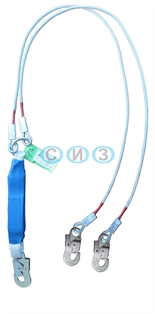 Строп аБд К20+К20 NL - страховочный строп, двойной (двуплечий) из металлического троса в ПВХ оболочке с амортизатором, и тремя малыми монтажными карабинами