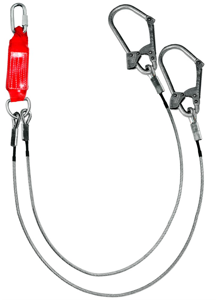 Строп аБд К50+Кс - страховочный строп, двойной (двуплечий) из металлического троса в ПВХ оболочке с амортизатором, двумя большими монтажными и одним соединительным карабином