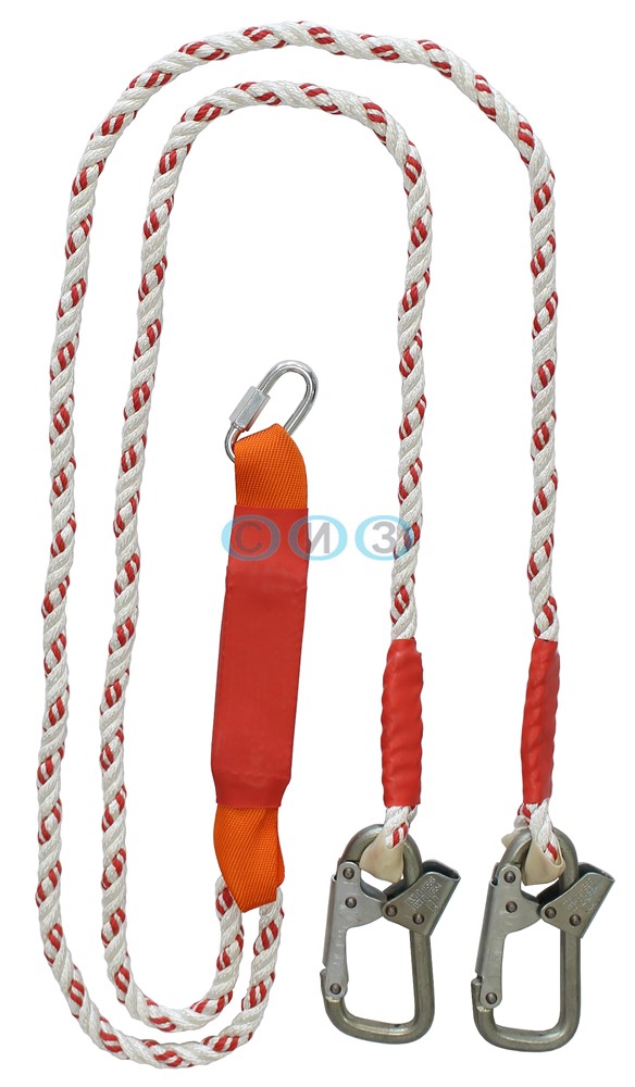 Строп аВд+Кс (канат) - страховочный строп, двойной (двуплечий) из полиамидного каната с амортизатором, двумя монтажными и одним соединительным карабином.