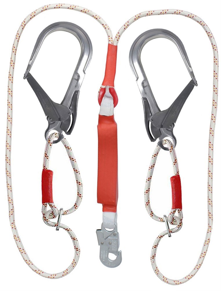 Строп аВрегд К110+К20 NL (канат в оплетке) - страховочный регулируемый двойной (двуплечий) строп из капроновой верёвки с амортизатором, двумя большими монтажными карабинами и одним малыми монтажными карабинами.