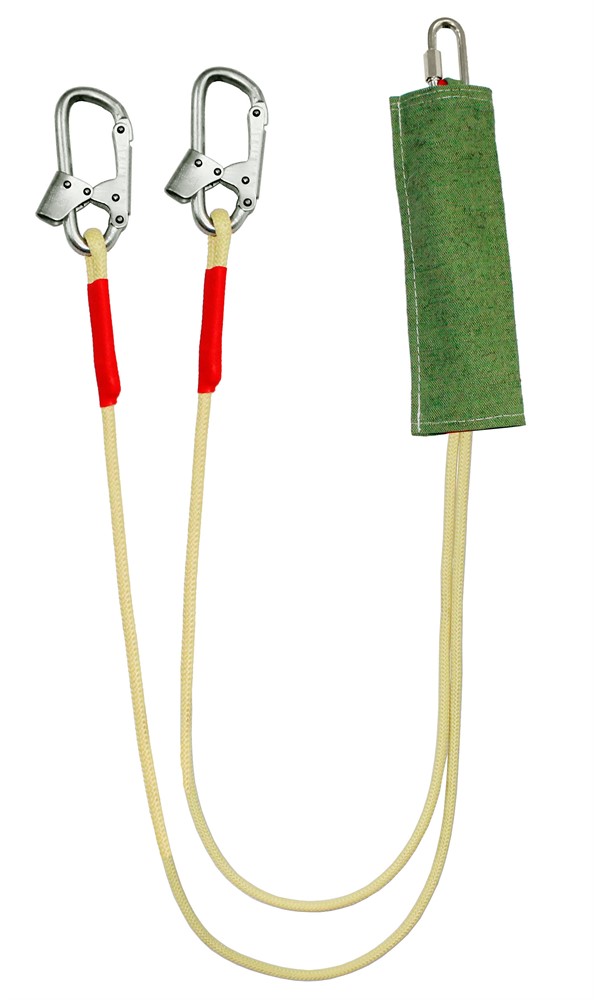 Строп аВердог+Кс - страховочный строп, двойной (двуплечий) из арамидной веревки с амортизатором в чехле из огнеупорного материала, двумя монтажными и одним соединительным карабином. Материал – огнеупорный, арамид с полиэфиром.