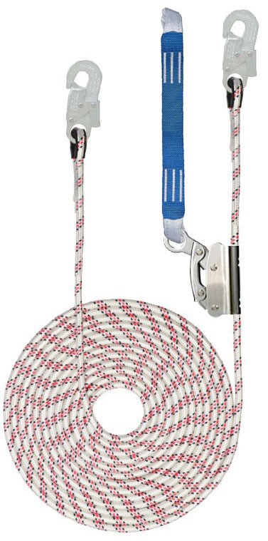 Зажим на гибкой анкерной линии ползункового типа (не разёмное страховочное устройство ползункового типа, оснащенное автоматическим замыкающим механизмом. Материал – сталь с гальванопокрытием. Используется с канатом с сердечником низкого растяжения диаметром 12 мм., концы стропа зашиты пластиковые коуши). Комплектуется блокирующим устройством ползункого типа со стрпом А (0,5 метра).