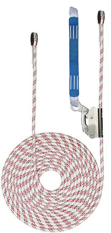 Зажим на гибкой анкерной линии ползункового типа (не разёмное страховочное устройство ползункового типа, оснащенное автоматическим замыкающим механизмом. Материал – сталь с гальванопокрытием. Используется с канатом с сердечником низкого растяжения диаметром 12 мм., концы стропа зашиты пластиковые коуши). Комплектуется блокирующим устройством ползункого типа со стрпом А (0,5 метра).