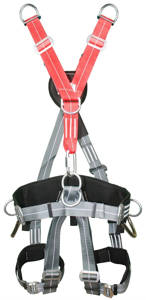 Страховочная привязь парашютного типа с наплечными и набедренными лямками которые регулируется самофиксирующимися пряжками, тремя элементами крепления стропа для страховки (на груди, спине и плечах) и тремя - для удержания и позиционирования(на поясе).