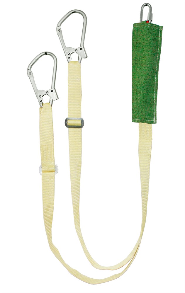 Строп аАдрегог К50+Кс - страховочный строп, двойной (двуплечий) регулируемый из арамидной ленты с амортизатором в чехле из огнеупорного материала, двумя большими монтажными и одним соединительным карабином