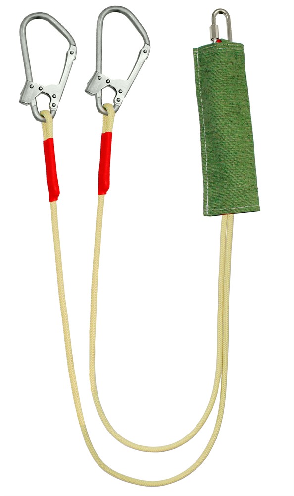 Строп аВердог К50+Кс - страховочный строп, двойной (двуплечий) из арамидной веревки с амортизатором в чехле из огнеупорного материала, двумя большими монтажными и одним соединительным карабином. Материал – огнеупорный, арамид с полиэфиром.