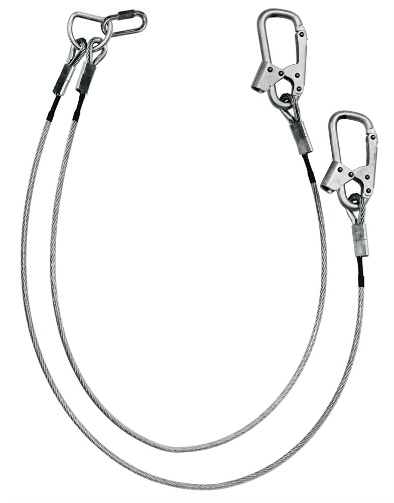 Строп Бд+Кс - строп, двойной (двуплечий) из металлического троса в ПВХ оболочке с двумя большими монтажными и одним соединительным карабином