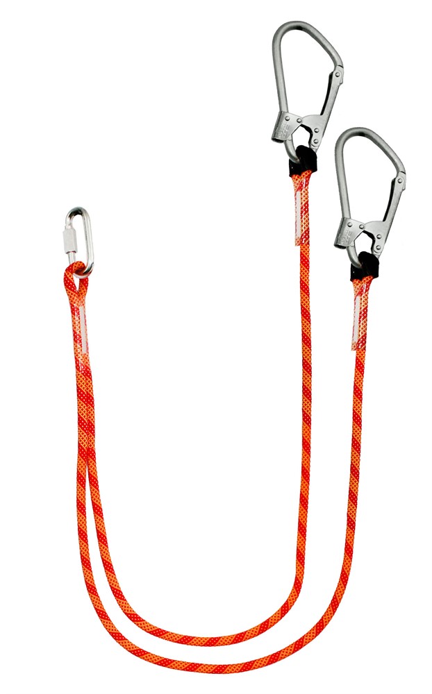 Строп Вд К50+Кс (канат в оплетке) - страховочный строп, двойной (двуплечий) из капроновой верёвки, двумя большими монтажными и одним соединительным карабином.