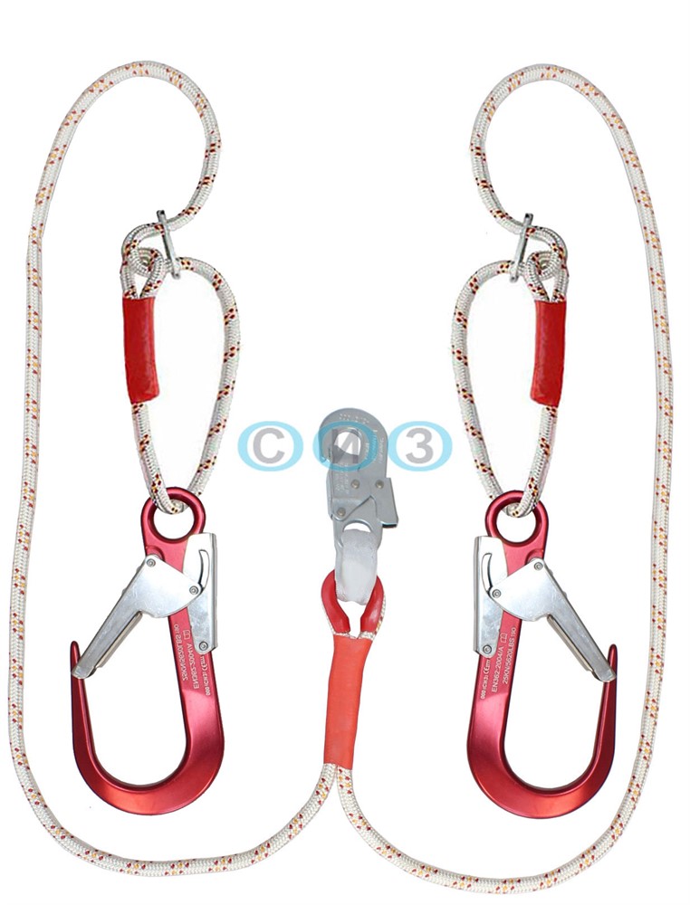 Строп Врегд К60+К20 NL (канат в оплетке) - страховочный регулируемый двойной (двуплечий) строп из капроновой верёвки с двумя большими монтажными карабинами и одним малыми монтажными карабинами.
